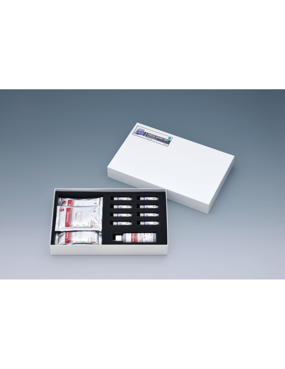 Estuche para el prensado de restauraciones de disilicato de litio sin metal en los colores A2, A3 y B2, así como piezas brutas de diferentes opacidades para la técnica de estratificación y de maquillaje.